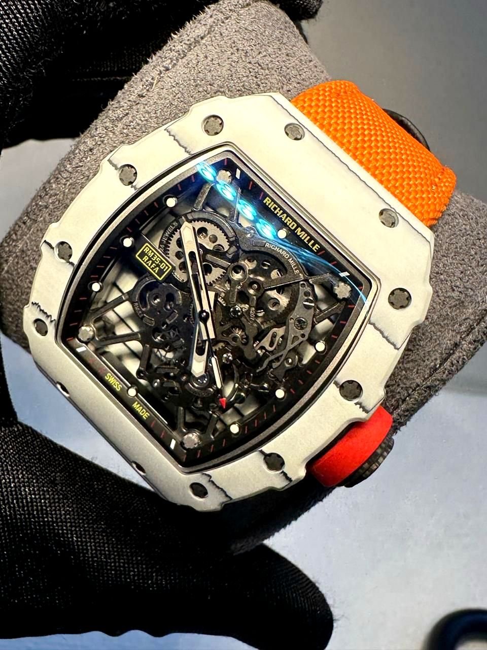 Be the first to review “Richard Mille RM 35-01 rafa white bazel with orange velcro strap super clone replica watches in Dubai”